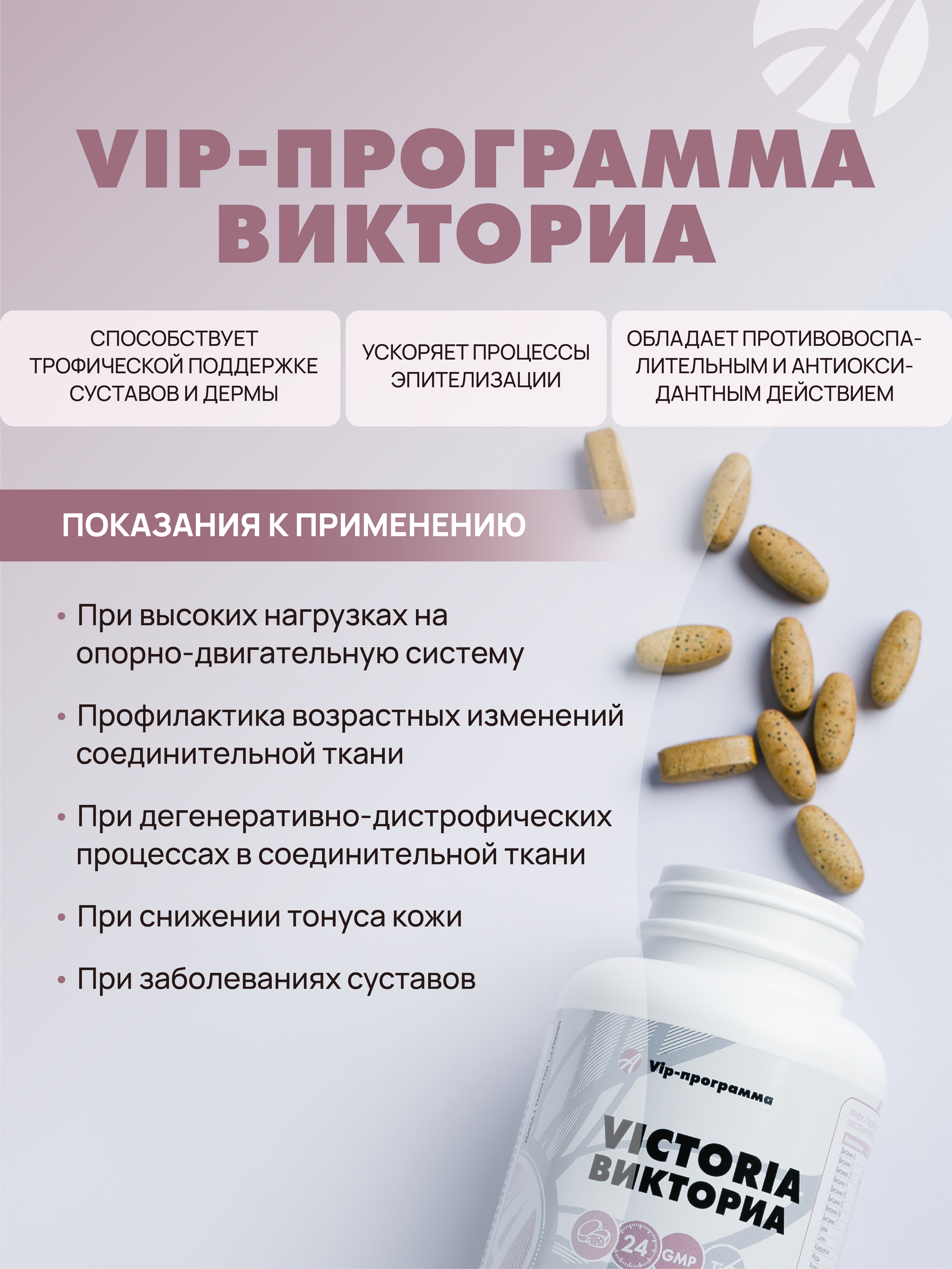Активные компоненты VIP-программы "Викториа" оказывают выраженное антиоксидантное действие, способствуют улучшению структуры кожи, волос, ногтей, подвижности суставов.