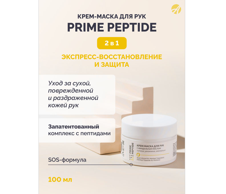Prime Peptide. Крем-маска для рук на основе пептидов, увлажняющих и восстанавливающих компонентов с миндальным маслом и пчелиным воском.