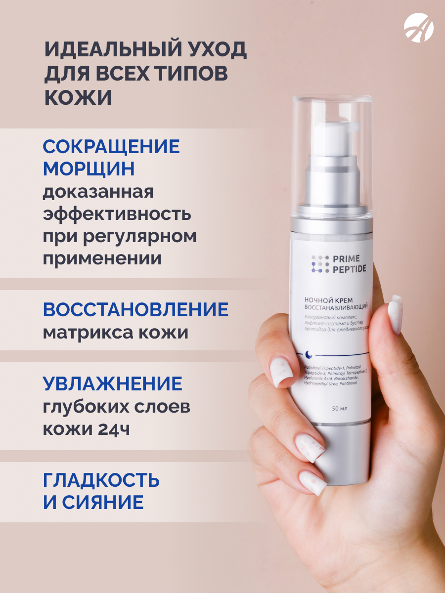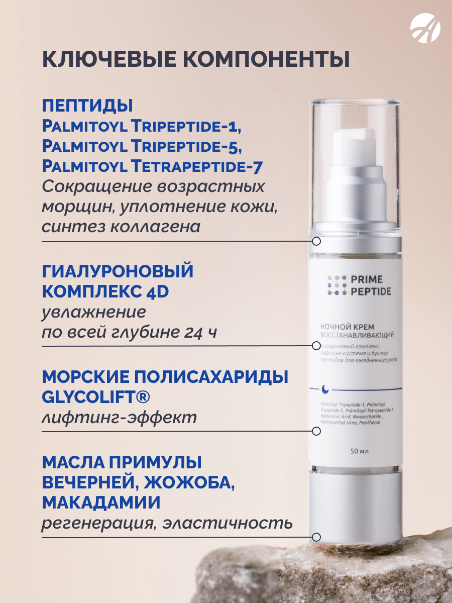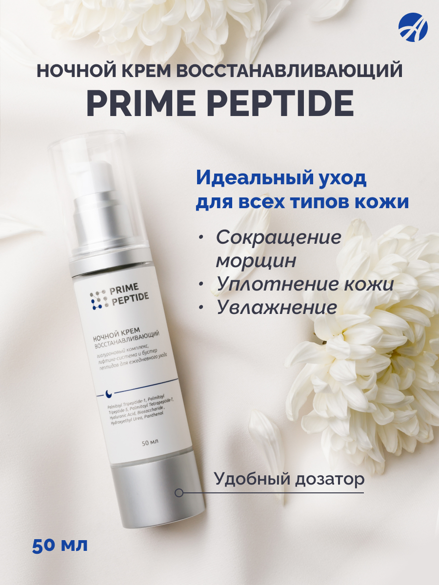 Крем ночной восстанавливающий Prime Peptide (Прайм Пептид). Интенсивный восстанавливающий ночной крем на основе уникальных омолаживающих и коллагенообразующих пептидов, лифтинг-системы, 4D гиалуроновой кислоты и морских полисахаридов.