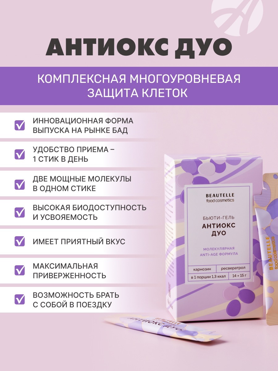 Антиокс ДУО. Замедляет старение на клеточном уровне. Защищает сосуды, мозг, кожу. Помогает клеткам эффективно производить энергию.